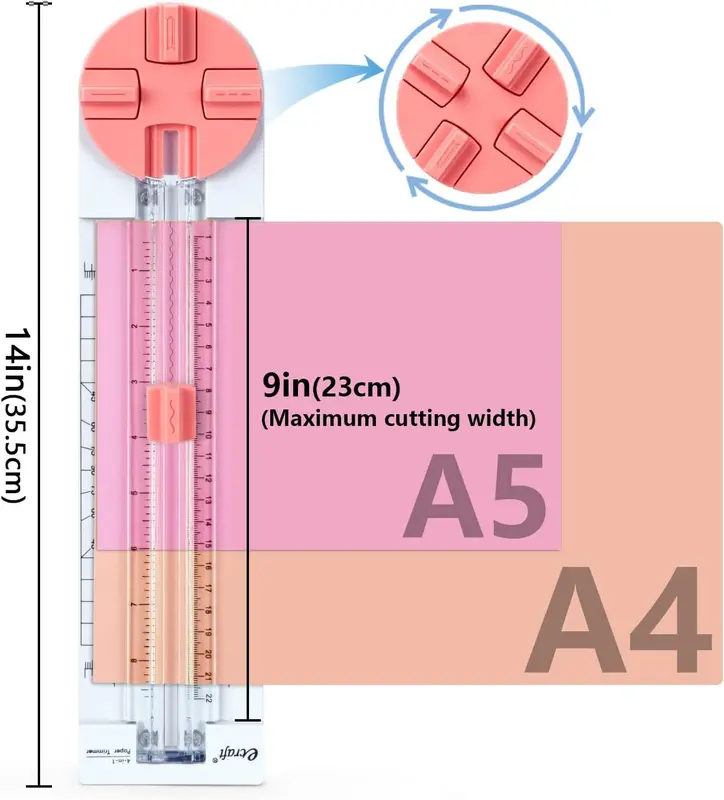 📐 Precise Cutting with EaseAchieve precise cuts with the 45-degree to 90-degree angle measuring plate and cm/inch scale. The rotary blade cuts in both directions. Transparent guides ensure straight cuts. Non-slip rubber pads provide stability. This cutter is made for accuracy and ease of use. With a maximum cutting width of 9 inches, it trims up to 5 sheets (80g/m2) at once.