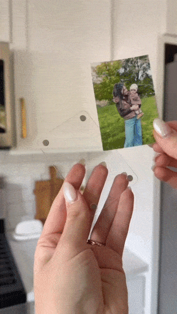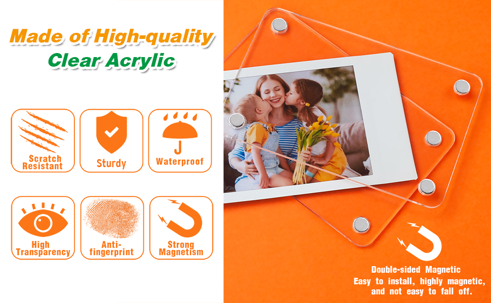 - Strong Magnetic and Pastable: The acrylic photo frame can be magnetic or pasted. 4 pairs of strong magnets securely hold 2 clear acrylic blocks and the photo. They can firmly attach the photo to the refrigerator or any metal surface without falling off. Stick the attached silicone pad onto the magnet to avoid scratches on the refrigerator.