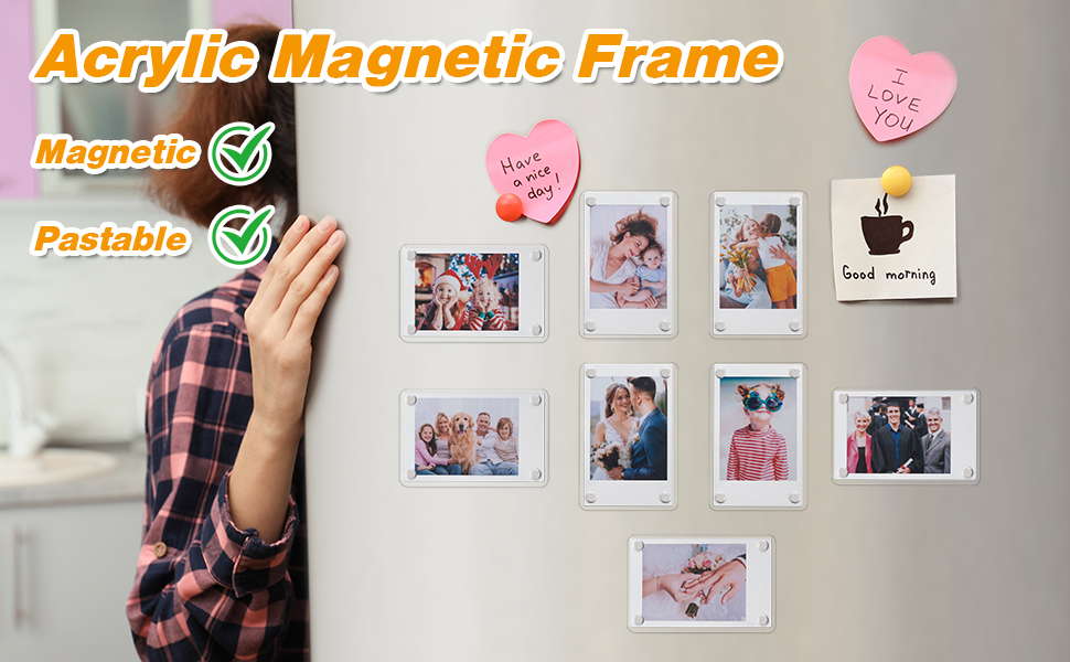 Beautiful memories can be seen everywhere, Our acrylic photo frames are magnetic and can be pasted, so you can hang your photos anywhere you want. These are very suitable for home, party, or office decoration, and will give the person you love a big surprise.