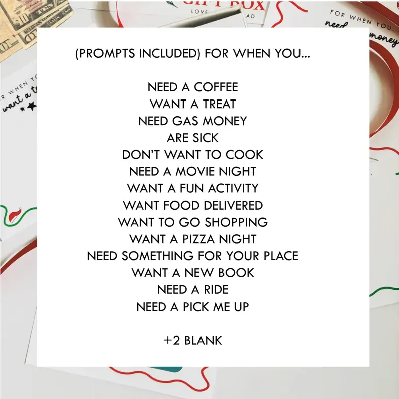14 cards are printed with gifting prompts, and 2 are blank for you to write your own! Gift cards/cash are not included. Cards are approximately 3.5 x 5 and are the perfect size for a standard sized gift card, or folded up cash.