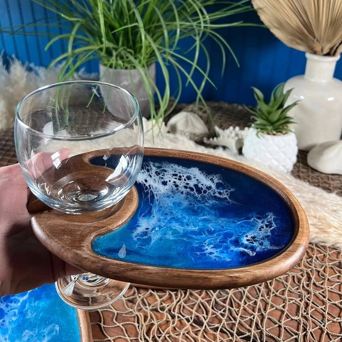 Wine glass appetizer plates are embellished with resin ocean waves. Use in your next picnic or party. Holds a stem or stemless wine glasss, keeping one hand free to grab your small bites.